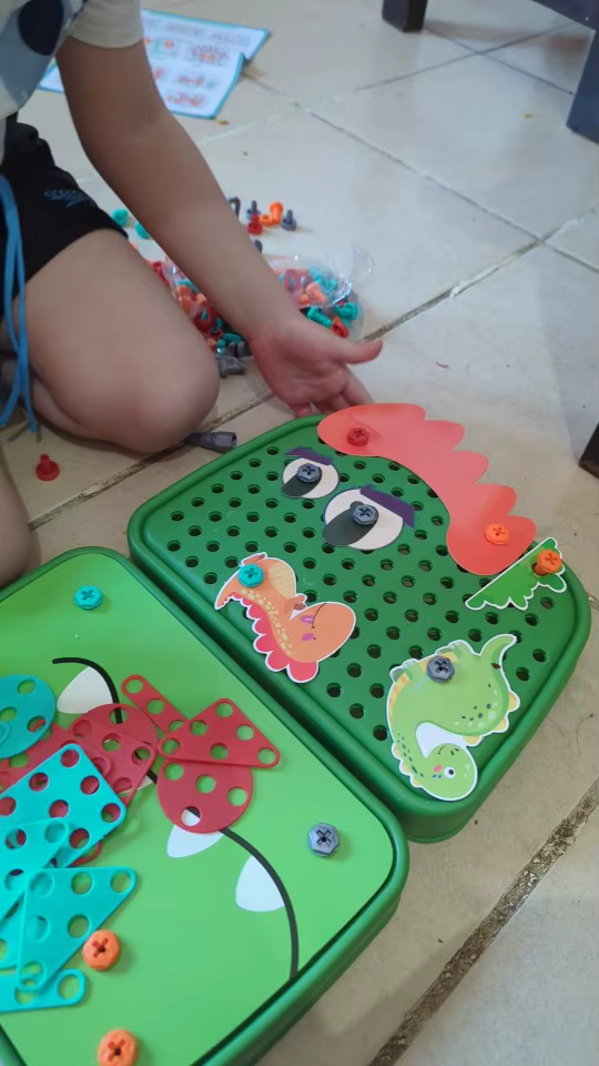 🔧 L’enfant place les pièces sur la plaque ou dans la boîte, puis utilise le tournevis ou la visseuse électrique pour construire ses modèles.