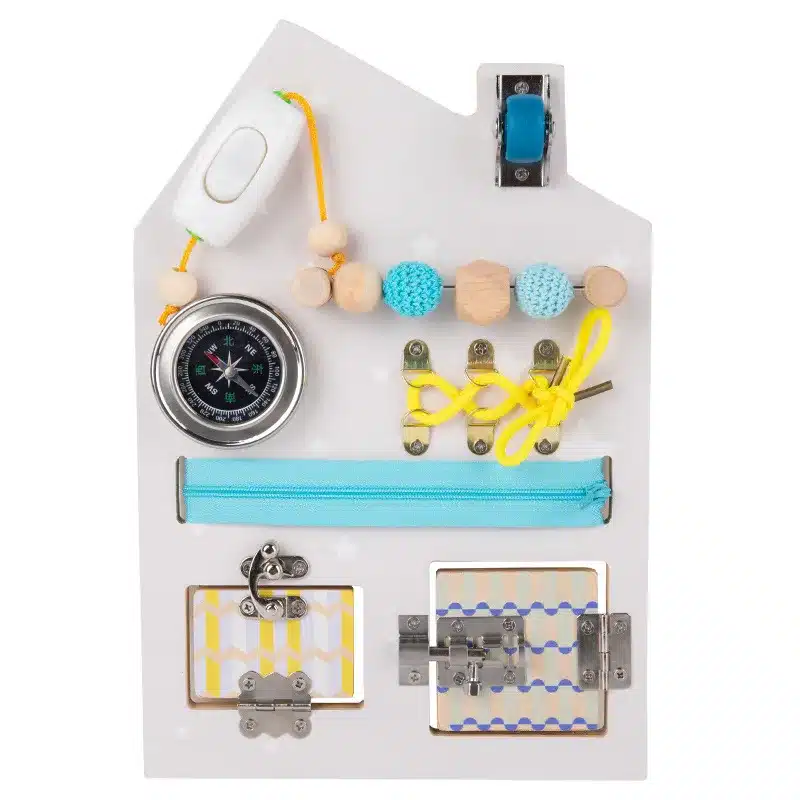 Le Busy Board Maison est bien plus qu’un simple jeu. C’est un atelier d’exploration stimulant chaque coin de l’esprit de votre enfant. Fabriqué avec soin, il offre: