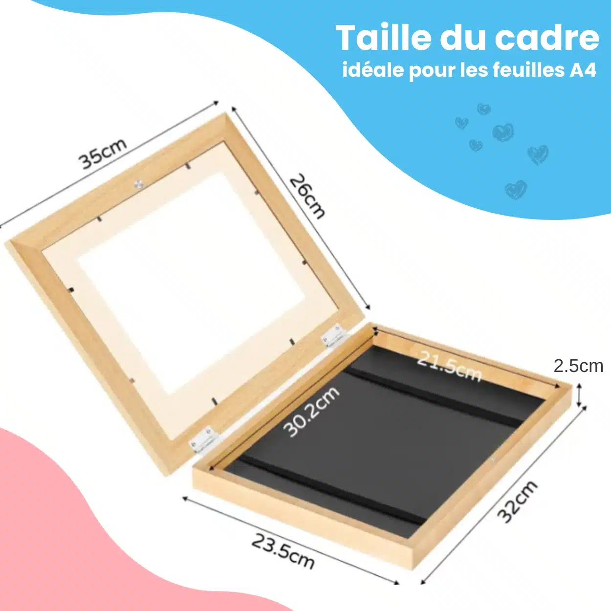 Le cadre peut contenir jusqu’à 150 dessins A4 grâce à sa structure intérieure souple.