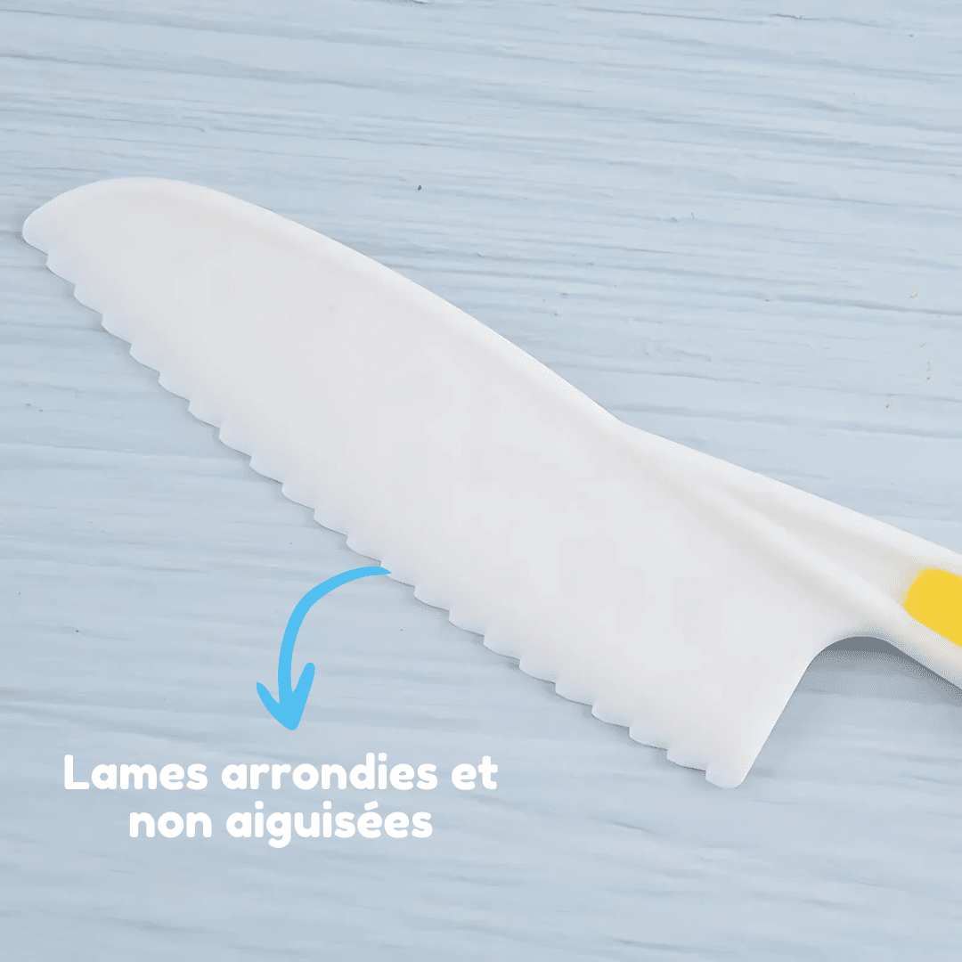 Les lames dentelées et non tranchantes de notre kit couteau facilitent la découpe des aliments tout en garantissant une sécurité optimale. Leur conception permet de trancher, découper et hacher facilement, sans aucun risque de coupure.